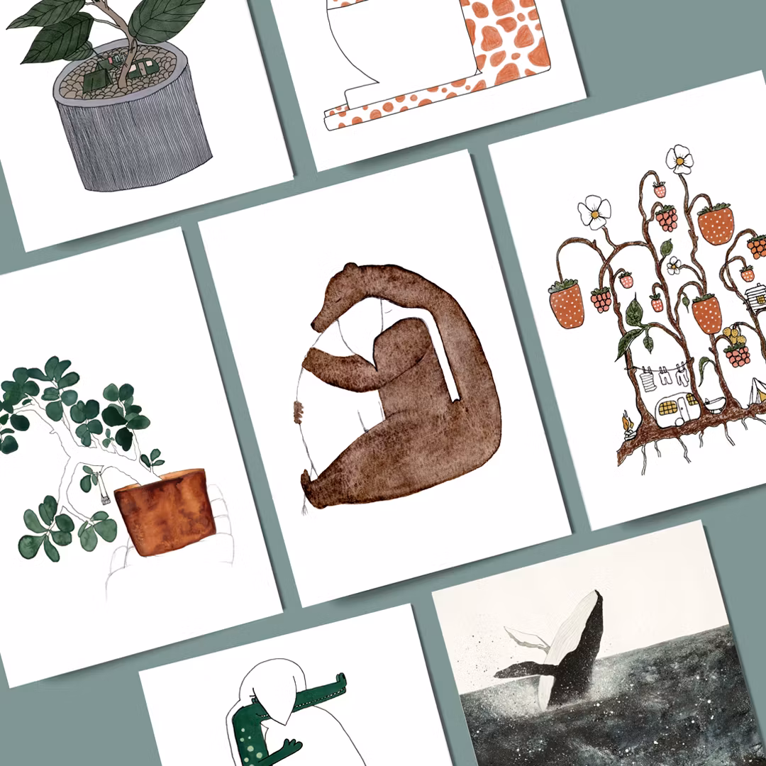 Ett färdigt kit med 8 st kort på vitt papper, strlk 10x15cm